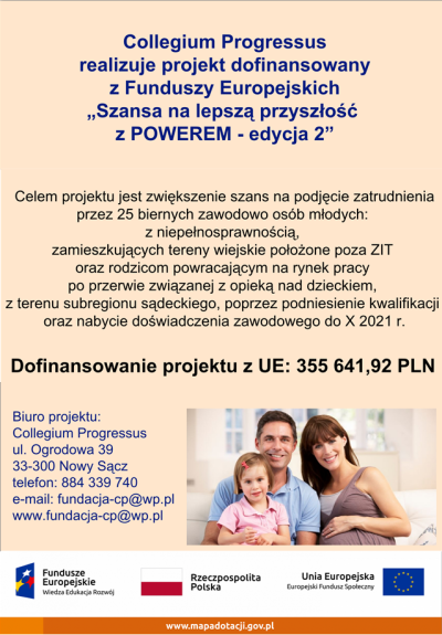 Fundacja Collegium Progressus ma zaszczyt zaprosić do udziału w projekcie pn. „Szansa na lepszą przyszłość z POWEREM - edycja 2” współfinansowanym przez Unię Europejską w ramach środków Europejskiego Funduszu Społecznego. Projekt realizowany jest w ramach Programu Operacyjnego Wiedza Edukacja Rozwój, Osi priorytetowej I. Osoby młode na rynku pracy, Działania 1.2 Wsparcie osób młodych pozostających bez pracy na regionalnym rynku pracy, Poddziałania 1.2.1 Wsparcie udzielane z Europejskiego Funduszu Społecznego. Ofertę projektu kierujemy do osób biernych zawodowo z grupy NEET w wieku 18-29 lat, zamieszkujących obszary wiejskie położone poza ZIT (Zintegrowanymi Inwestycjami Terytorialnymi), do Rodziców chcących powrócić do pracy po przerwie związanej z opieką nad dzieckiem lub do osób z niepełnosprawnościami.