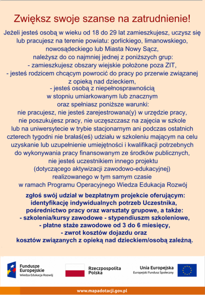 W ramach projektu zakładamy objęcie wsparciem 25 osób zamieszkujących, uczących się lub pracujących na terenie powiatu nowosądeckiego, gorlickiego, limanowskiego, nowosądeckiego lub Miasta Nowego Sącza. Każdy Uczestnik będzie mógł skorzystać BEZPŁATNIE ze szkoleń i kursy zawodowych zapewniających stypendium szkoleniowe; a także z płatnych staży zawodowych trwających od 3 do 6 miesięcy. Ponadto przewiduje się identyfikację indywidualnych potrzeb Uczestnika, pośrednictwo pracy, warsztaty grupowe, a także zwrot kosztów dojazdu oraz kosztów związanych z opieką nad dzieckiem/osobą zależną. Celem projektu jest zwiększenie szans zatrudnienia przez bierne zawodowo osoby, podniesienie ich kwalifikacji i nabycie doświadczenia zawodowego do października 2021 roku. Szczegółowe informacje o projekcie wraz z Regulaminem Projektu można znaleźć na stronie internetowej: www.fundacja-cp.pl, pod numerem telefonu: 884-339-740, w Biurze Projektu: ul. Ogrodowa 39, 33-300 Nowy Sącz, a także pod adresem e-mail: fundacja-cp@wp.pl.