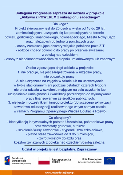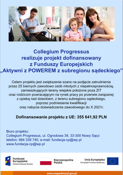 Fundacja Collegium Progressus ma zaszczyt zaprosić do udziału w projekcie pn. „Aktywni z POWEREM z subregionu sądeckiego” współfinansowanym przez Unię Europejską w ramach środków Europejskiego Funduszu Społecznego. Projekt realizowany jest w ramach Programu Operacyjnego Wiedza Edukacja Rozwój, Osi priorytetowej I. Osoby młode na rynku pracy, Działania 1.2 Wsparcie osób młodych pozostających bez pracy na regionalnym rynku pracy, Poddziałania 1.2.1 Wsparcie udzielane z Europejskiego Funduszu Społecznego.