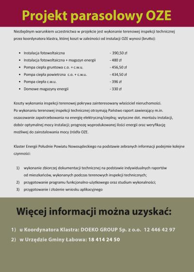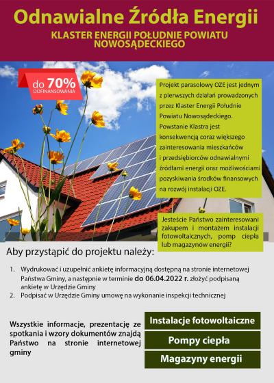 Gmina Łabowa, widząc zapotrzebowanie i zainteresowanie mieszkańców Odnawialnymi Źródłami Energii na swoim terenie, informuje o możliwości pozyskania dofinansowania dla instalacji OZE: fotowoltaiki, pomp ciepła, magazynów energii. Nabór jest prowadzony w ramach Klastra Energii Południe Powiatu Nowosądeckiego, a przewidywany poziom dofinansowania to 70%.