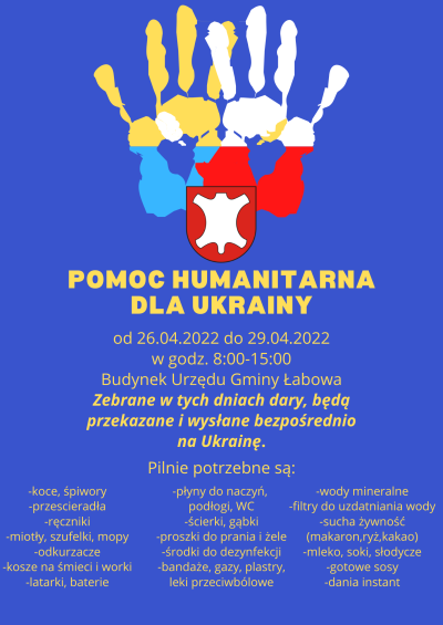 Pomoc humanitarna dla Ukrainy 22.04.2022 15:20 Treść Od 26.04.2022 do 29.04.2022 w godz. 8:00-15:00 w Budynku Urzędu Gminy Łabowa zbierane będą w tych dniach dary, które zostaną przekazane i wysłane bezpośrednio na Ukrainę. Facebook Twitter Email Drukuj